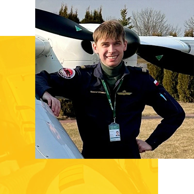 Konrad to instruktor młodego pokolenia, który łączy solidne przygotowanie inżynierskie z pasją do latania i nauczania.